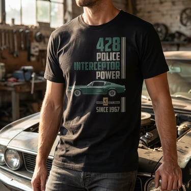 "428 Police Interceptor Power." Mentions the surprising origin of the Big Block V8 engine, a crucial detail for those studying the car's history.